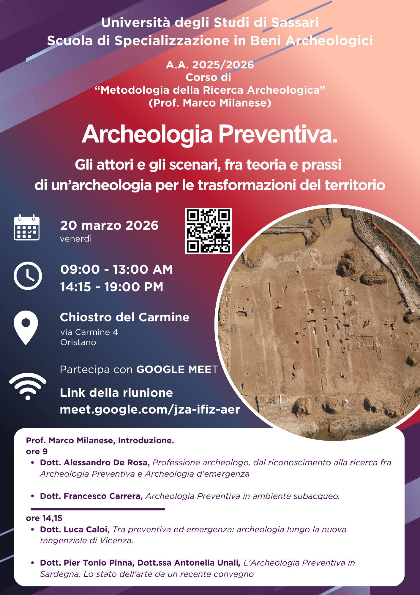A seguire nel pomeriggio il Dott. Pier Tonio Pinna e la Dott.ssa Antonella Unali interverranno con il lavoro su “L’archeologia Preventiva in Sardegna. Lo stato dell’arte da un recente convegno”.